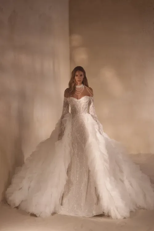 A fitted dress with a small train that has a removable train from the waist. The dress is made of Mikado fabric, fastens with a zipper and has lacing inside. The corset is with a falling lapel. A removable waist bow is at the back.